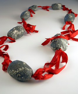 This process was tedious! I had to grab the end of the staple to be melted with my third arm, making it stick up just enough that I could melt the wire and not cause any damage to the cubes. I also had to quench the necklace after melting each ball so I would not burn my fingers as I set-up for the next round--after patting the necklace dry, I set-up the system again. The completed necklace pictured at the top is composed of 40 cubes and took about 9 hours to connect.