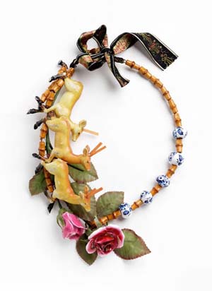 Daniel's story is fascinating. I won't bother to explain it all to you now, my writing will not do it justice. However, you can watch a wonderful video, titled "My Way", that is well-worth its seven minute length even though it's entirely in Dutch. I can't understand one word of it, but get a good sense of Daniel and his work. It shows him picking up a flattened can off the street and putting it in his pocket and later shows him in his studio sorting frogs from mounds of plastic toys. I imagine him talking about how he chooses materials and explaining his process. Toward the end of the video you see him standing among the works in his exhibition, "Plastique C'est Chic - Bijoux Eternels" at Grand-Hornu in 2010. You can also read (in English!) a great interview here. After watching the video and reading the book and interview, I got this feeling that this person absolutely loves what he does and makes work for all the right reasons in the most genuine way possible.